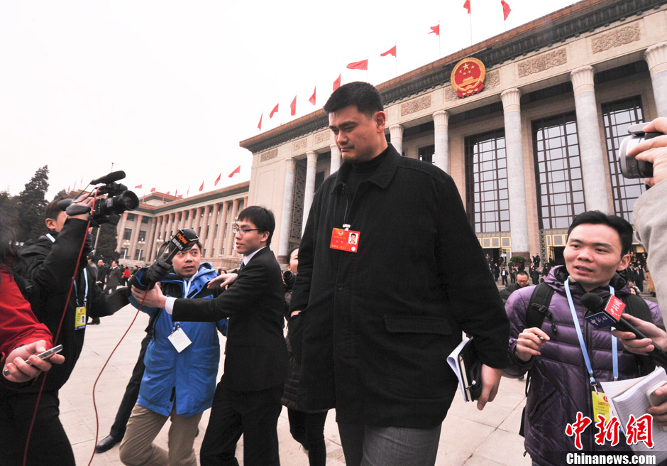 3月2日,全国政协新委员姚明在北京参加全国政协十二届一次会议预备会,走出会场面对媒体记者追问一言不发。 中新社发 贾国荣 摄
