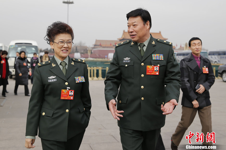3月2日,全国政协十二届一次会议预备会议在人民大会堂举行,全国政协委员宋春丽和魏积安步入会场。中新社发 盛佳鹏 摄