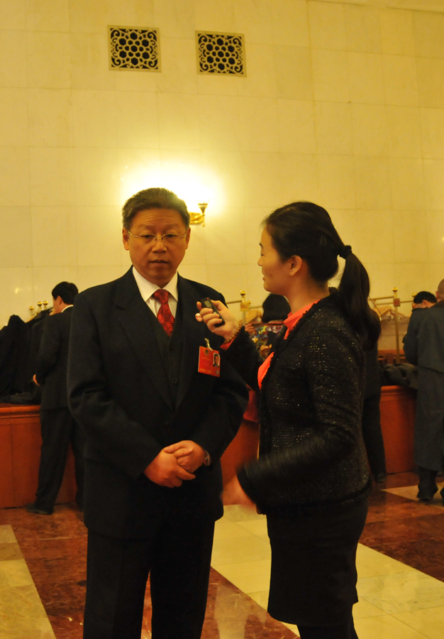 2013年3月3日下午3时,全国政协十二届一次会议在人民大会堂举行开幕会,听取政协全国委员会常务委员会工作报告,听取政协全国委员会常务委员会关于提案工作情况的报告。图为全国政协委员、国务院扶贫办主任范小建接受新华网、中国政府网记者专访。 宋君毅 摄