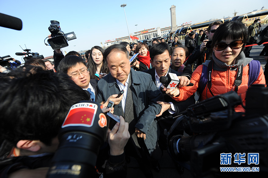 2013年3月3日下午3时,全国政协十二届一次会议在人民大会堂举行开幕会。图为全国政协委员莫言遭遇媒体记者围堵采访。新华网/中国政府网 陈竞超 摄