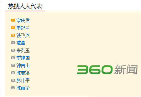新华网北京3月4日电 十二届全国人大一次会议将于5日上午开幕,媒体和网民对两会关注热情升温。360新闻搜索提供的数据显示,截至4日16时,最受网友关注的人大代表前5位分别是宗庆后、申纪兰、铁飞燕、谭晶、朱列玉。相对于3日的热搜榜,宗庆后的关注度由第4位升至第1位,谭晶则首次进入TOP5序列。