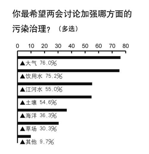 3月1日至3月4日,中国青年报社调中心通过题客调查网进行的调查显示,83.0%的人感觉自己周围环境污染情况严重。76.0%的人最希望今年两会讨论大气污染治理。关于饮用水(75.2%)、江河水(55.0%)、土壤(54.6%)、海洋(36.3%)、草场(30.3%)的治理也获得较高关注度。全国31个省(自治区、直辖市)6248人参与调查,14~45岁的青年占89.1%。