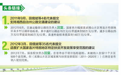 连续三届全国人大代表。履职10年来,主要围绕“三农”、中小企业发展和加快改变湘西落后面貌等问题,向大会提交建议60余件。今年带来改革土地管理制度的建议,希望提高农民在土地增值收益中的分配比例,整体推进失地农民市民化,使其平等享受城镇公共服务、社会保障。