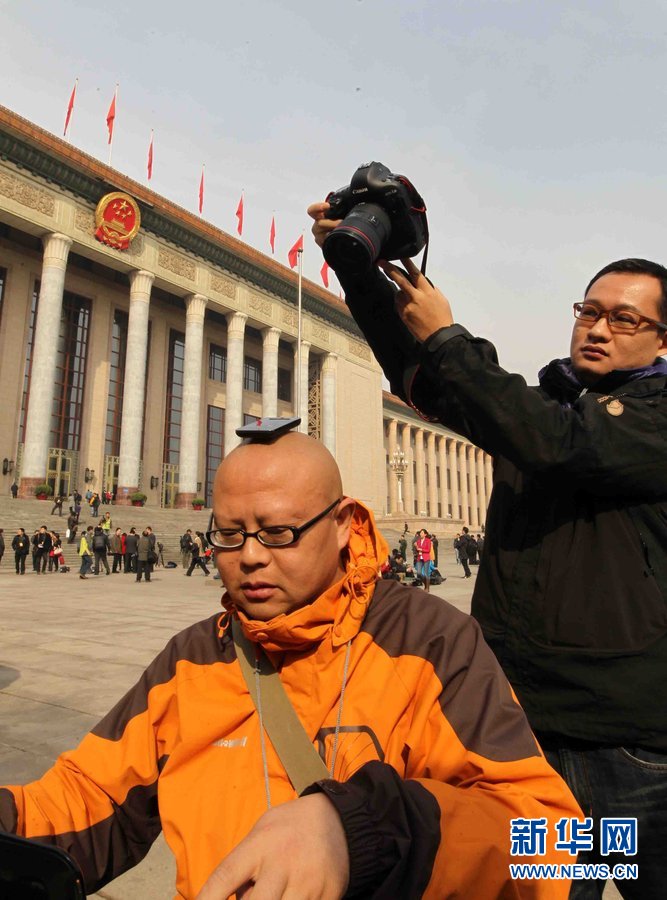 2013年03月05日,北京,第十二届全国人大开幕,两会记者百态。无线网卡:头顶无线网卡发稿的记者。