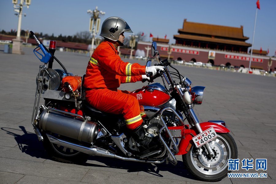 2013年3月4日,北京,用于小型火场救援的消防摩托车在天安门广场巡逻。消防摩托车