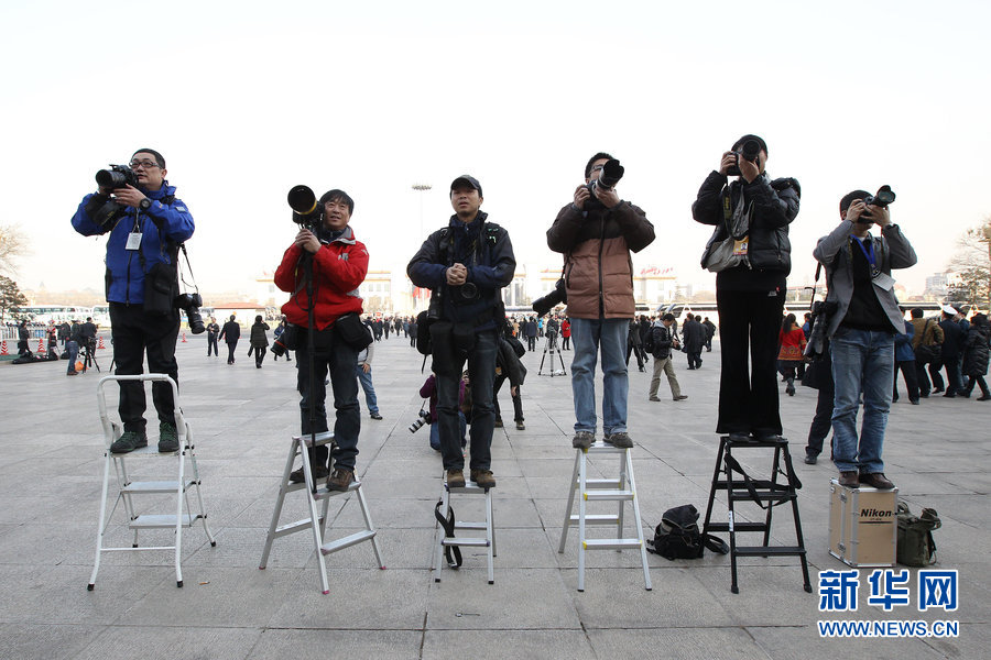 2013年3月3日下午三点,全国政协十二届一次会议在人民大会堂开幕。梯子:摄影记者端着长枪短炮站在弟子上蹲守委员。