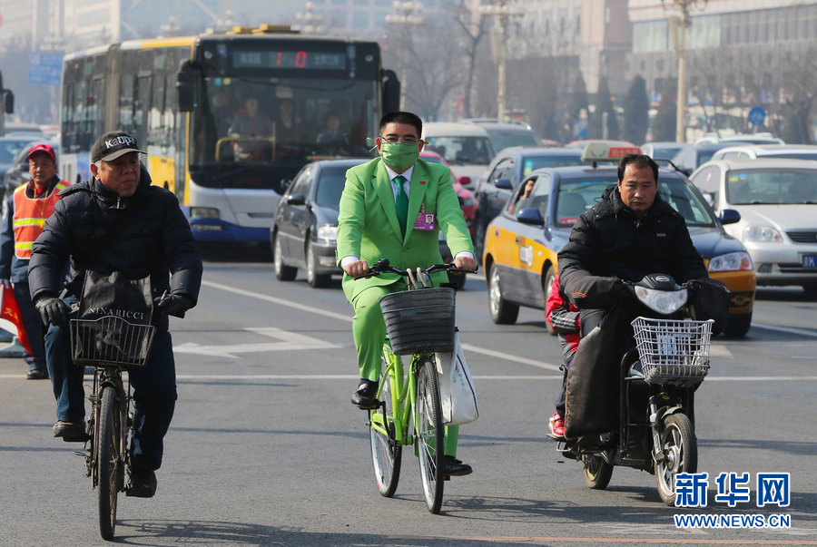 2013年3月3日下午,北京,骑着绿色自行车沿着长安街前往大会堂旁听全国政协会议。