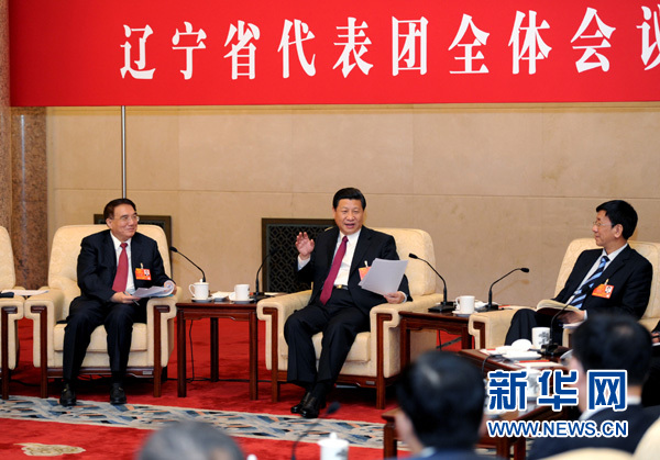 习近平参加了辽宁代表团审议。陈政高、陈海波、李万才、张文成、项晓云、王金笛、耿洪臣、张广宁等8位代表先后围绕加快实现辽宁老工业基地全面振兴、推进辽宁沿海经济带建设、推动实现更高质量的就业等问题踊跃发言,畅谈感受、设想、建议。习近平认真听取和记录,不时询问情况,并作了重要讲话。习近平指出,要进一步做好攻坚克难、艰苦创业的思想准备和工作准备,大力实施振兴东北地区等老工业基地战略,加快建设社会主义新农村,全面增强工业核心竞争力,促进资源型城市可持续发展,建设向东北亚开放的重要枢纽。要大力做好保障和改善民生工作,注重关心生活困难群众,让群众得到看得见、摸得着的实惠。习近平强调,要大力加强思想道德建设。雷锋、郭明义、罗阳身上所具有的信念的能量、大爱的胸怀、忘我的精神、进取的锐气,正是我们民族精神的最好写照,他们都是我们“民族的脊梁”。要充分发挥各方面英模人物的榜样作用,大力激发社会正能量,为实现“中国梦”提供强大精神动力。