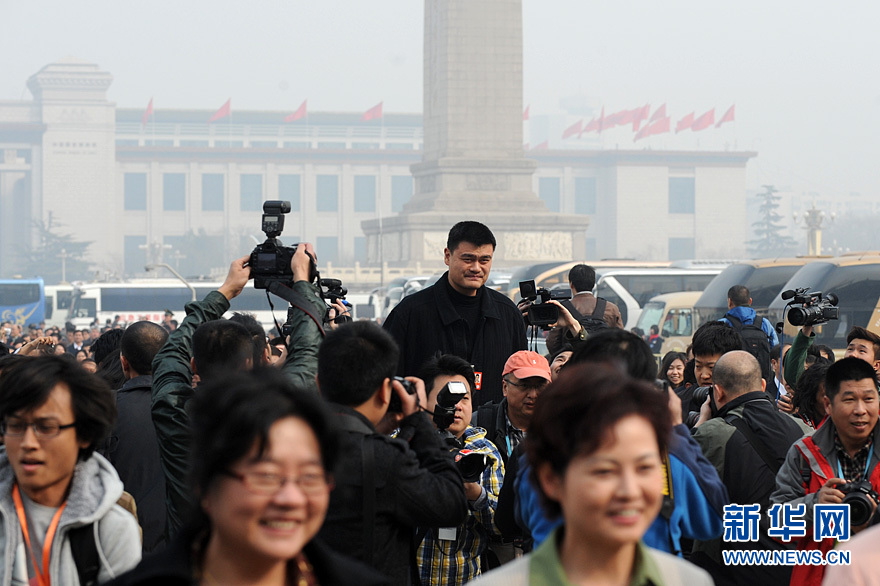 3月7日下午3时,全国政协十二届一次会议在人民大会堂举行第二次全体会议,多名政协委员作大会发言。这是政协委员姚明从大会堂东门广场步入会场。新华网 陈竞超 摄