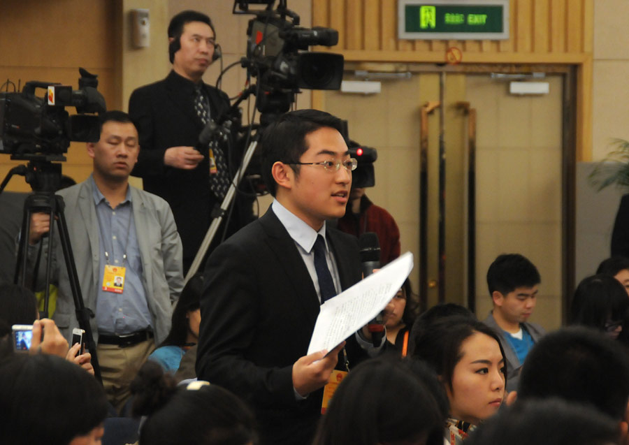 3月7日(星期四)下午3时,十二届全国人大一次会议新闻中心在梅地亚中心多功能厅举行记者会。科技部部长万钢将就“创新驱动发展战略”的相关问题回答中外记者的提问。图为央视记者提问。 翟子赫 摄