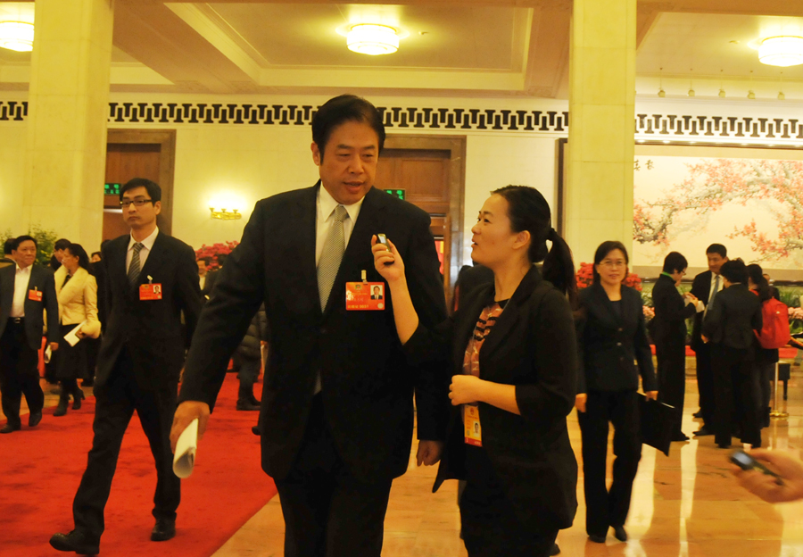 3月8日(星期五)上午9时,全国政协十二届一次会议在人民大会堂举行第三次全体会议,多名政协委员作大会发言。图为上海市政协主席吴志明接受新华网、中国政府网记者采访。宋君毅 摄