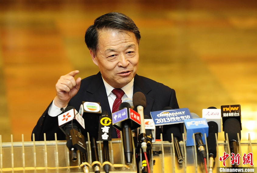 3月8日,十二届全国人大一次会议举行全体会,交通运输部部长杨传堂在入场途中被“拦截”接受采访。中新社发 侯宇 摄