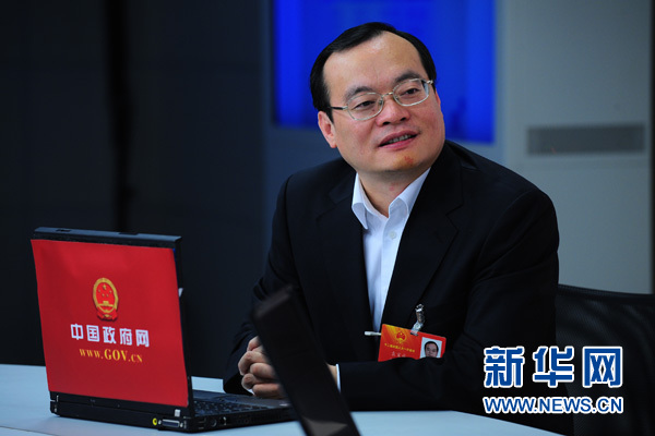 2013年3月9日11:00,全国人大代表、东莞市市长袁宝成做客新华网两会访谈,与网友交流如何创新社会管理。新华网 李欣 摄