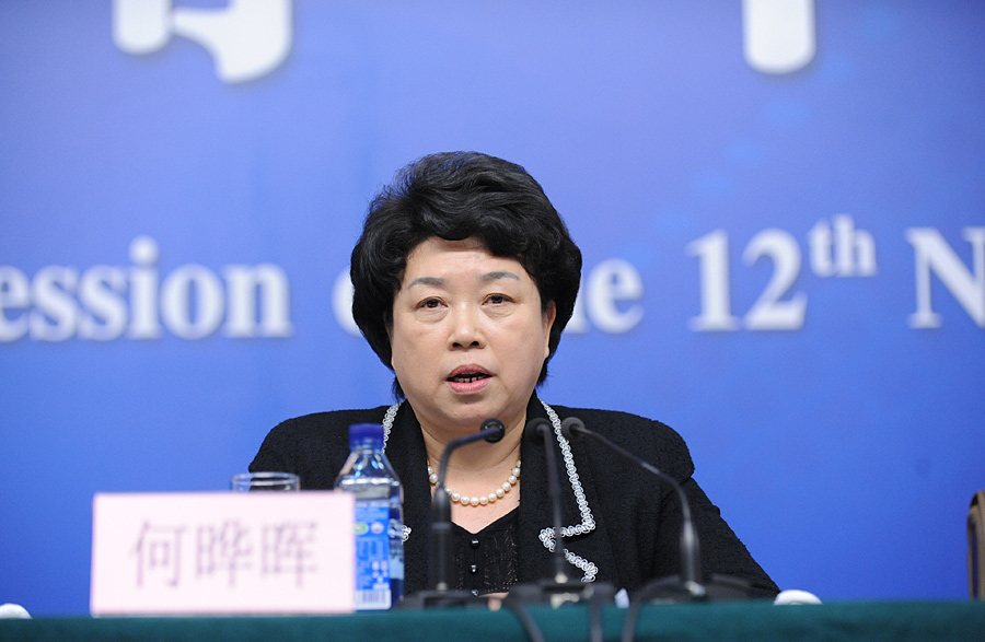 3月9日下午3时,十二届全国人大一次会议新闻中心在梅地亚中心多功能厅举行记者会。图为全国人大常委会副秘书长何晔晖。 新华网/中国政府网 陈竞超 摄