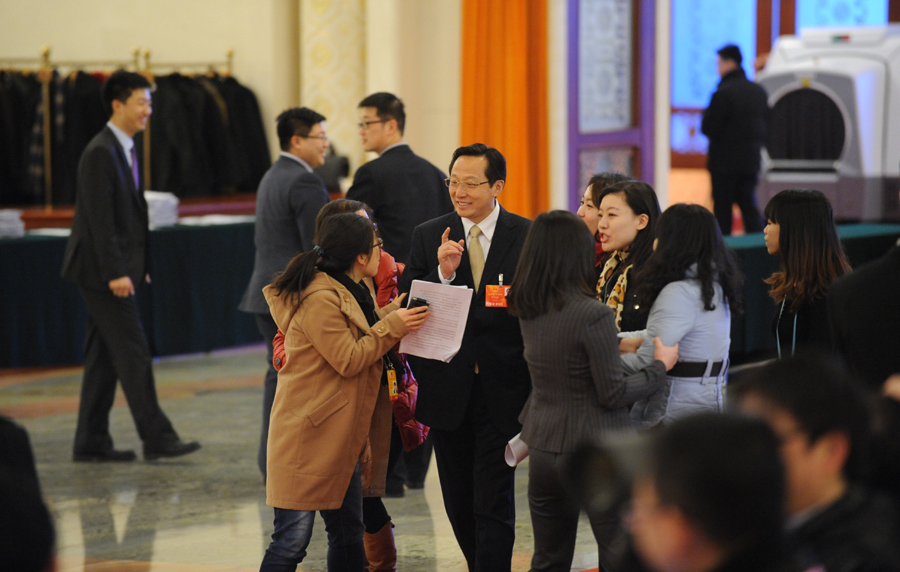 3月10日,第十二届全国人民代表大会第一次会议举行第三次全体会议,听取最高人民法院院长王胜俊作最高人民法院工作报告;听取最高人民检察院检察长曹建明作最高人民检察院工作报告;听取国务委员兼国务院秘书长马凯关于国务院机构改革和职能转变方案的说明;表决第十二届全国人民代表大会第一次会议选举和决定任命的办法草案。在会议开始前,人民大会堂北大厅的集体采访区,农业部部长韩长赋也没能逃过记者的“追堵”。新华网/中国政府网 陈竞超 摄