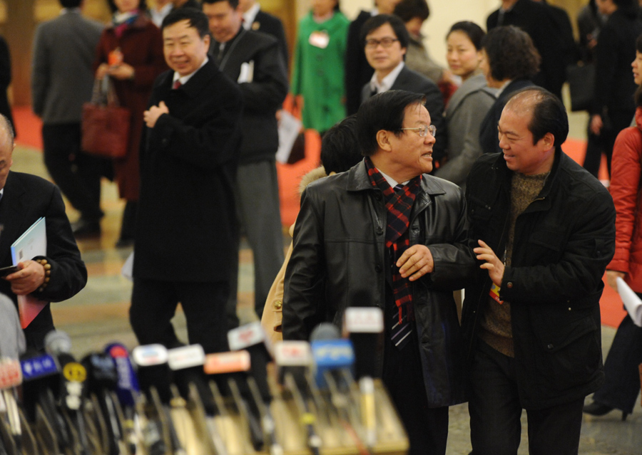 3月10日,第十二届全国人民代表大会第一次会议举行第三次全体会议,听取最高人民法院院长王胜俊作最高人民法院工作报告;听取最高人民检察院检察长曹建明作最高人民检察院工作报告;听取国务委员兼国务院秘书长马凯关于国务院机构改革和职能转变方案的说明;表决第十二届全国人民代表大会第一次会议选举和决定任命的办法草案。图为文化部部长蔡武被记者“拉”进采访区。新华网/中国政府网 陈竞超 摄