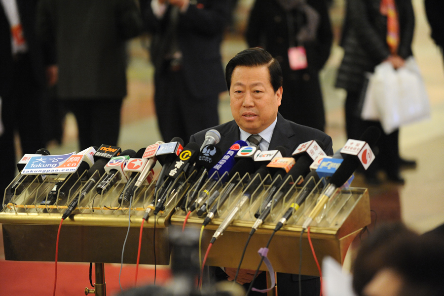 3月10日,第十二届全国人民代表大会第一次会议举行第三次全体会议,听取最高人民法院院长王胜俊作最高人民法院工作报告;听取最高人民检察院检察长曹建明作最高人民检察院工作报告;听取国务委员兼国务院秘书长马凯关于国务院机构改革和职能转变方案的说明;表决第十二届全国人民代表大会第一次会议选举和决定任命的办法草案。图为环保部部长周生贤接受记者群访。新华网/中国政府网 陈竞超 摄