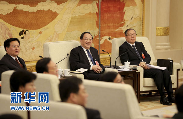 2013年3月5日,俞正声参加十二届全国人大一次会议湖北代表团的审议。 新华社记者丁林摄