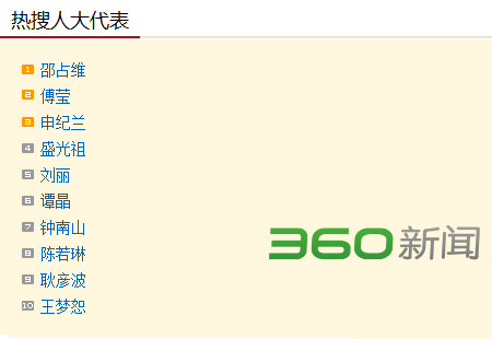 根据360新闻搜索提供的数据,截至12日16时,最受网友关注的人大代表前五位分别是邵占维、傅莹、申纪兰、盛光祖和刘丽。钟南山就 “灰霾是否致癌”回应了方舟子质疑,再次成为新闻焦点人物。“最美洗脚妹”刘丽就农民工夫妻两地分居问题提出了建议,引发网友热议。