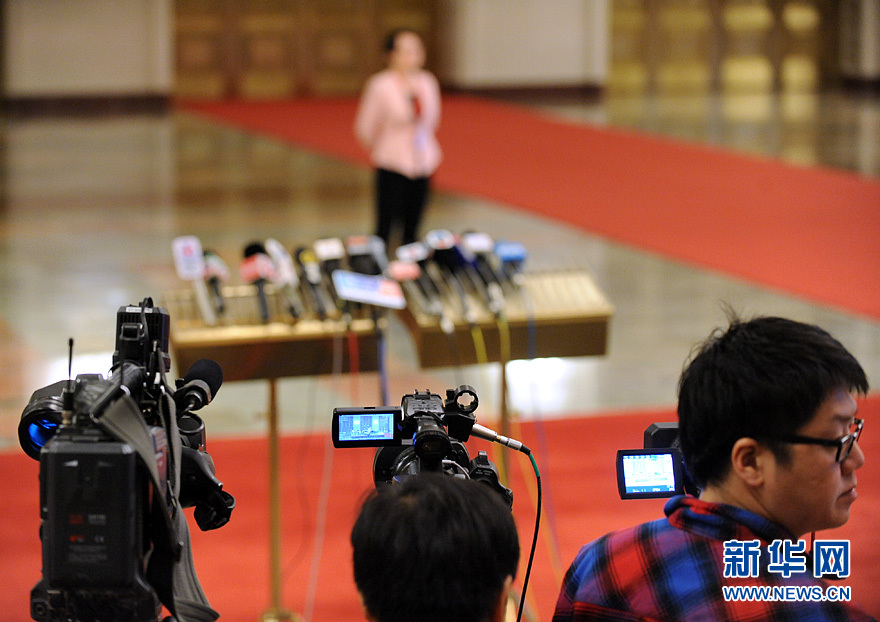 十二届全国人大一次会议3月14日上午举行第四次全体会议,选举第十二届全国人民代表大会常务委员会委员长、副委员长、秘书长,选举第十二届全国人民代表大会常务委员会委员,选举中华人民共和国主席、副主席,选举中华人民共和国中央军事委员会主席;表决关于国务院机构改革和职能转变方案的决定草案。早上8时左右,记者们早早来到大会堂北大厅,在这里等候由此进入会场的部长们。新华网 陈竞超 摄