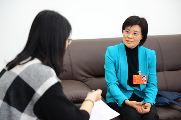 2013年3月13日,全国人大代表、阳光集团董事长陈丽芬做客新华网两会特别访谈,与网友交流中国自主品牌走向世界相关话题。图为主持人与嘉宾沟通。张鸿 摄