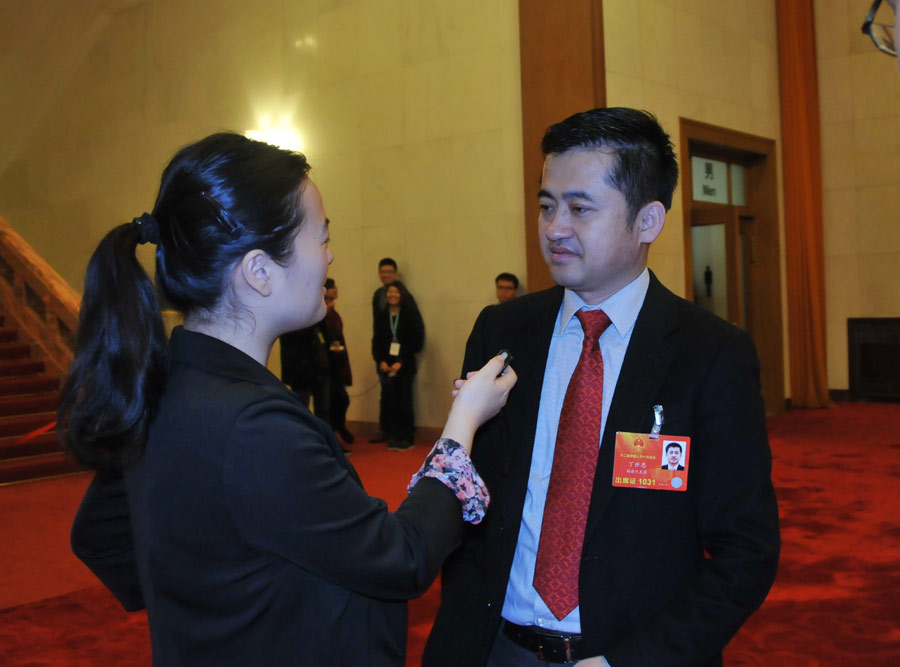 3月14日(星期四)9时,十二届全国人大一次会议在人民大会堂举行第四次全体会议,表决关于国务院机构改革和职能转变方案的决定草案;表决总监票人、监票人名单草案;选举第十二届全国人民代表大会常务委员会委员长、副委员长、秘书长;选举第十二届全国人民代表大会常务委员会委员;选举中华人民共和国主席、副主席;选举中华人民共和国中央军事委员会主席。图为全国人大代表、安踏(中国)有限公司董事局主席丁世忠接受新华网、中国政府网记者采访。宋君毅 摄