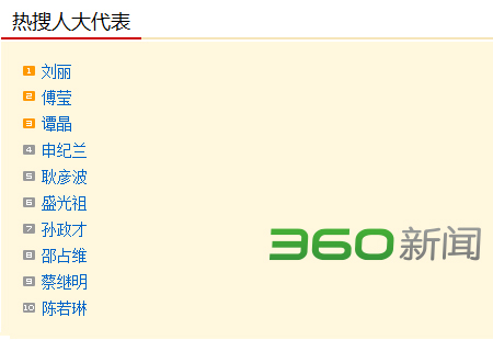 根据360新闻搜索提供的数据,截至15日16时,最受网友关注的人大代表前五位分别是刘丽、傅莹、谭晶、申纪兰和耿彦波。盛光祖因中国铁路总公司的成立而备受关注,陈若琳在2013年国际泳联世界跳水系列赛北京站女子双人10米跳台决赛中夺冠,再次成为新闻焦点人物。