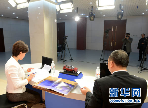 2013年3月15日,全国人大代表、铜仁市市长市长夏庆丰做客新华网两会访谈,与网友谈两会议案建议。图为访谈前的准备。新华网 郭小天 摄