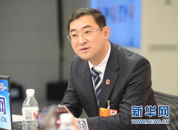 2013年3月15日,全国人大代表、黑龙江省哈尔滨市宾县县委书记赵革做客新华网两会特别访谈。图为访谈嘉宾赵革。新华网 郭小天 摄