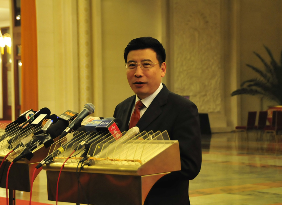 3月17日上午9时,第十二届全国人民代表大会第一次会议在人民大会堂举行闭幕会。图为工业和信息化部部长苗圩会前接受记者集体采访。苏影 摄