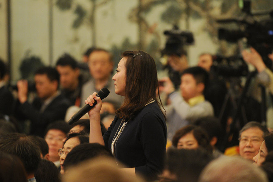 3月17日上午,十二届全国人大一次会议举行闭幕会,大会闭幕后,国务院总理李克强在人民大会堂金色大厅与中外记者见面并回答记者提问。图为中国日报记者提问。新华网/中国政府网 翟子赫 摄