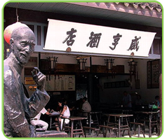 清光绪甲午年(公元1894年),鲁迅堂叔周仲翔等在绍兴城内的都昌坊口开设一家小酒店。店主从《易经.坤卦》之《彖传》“含弘广大,品物咸亨”句中,取“咸亨”两字为店名,寓意酒店生意兴隆,万事亨通。鲁迅先生在《孔乙己》、《风波》和《明天》等著名小说中,把咸亨酒店作为重要背景,使咸亨酒店名扬海内外。