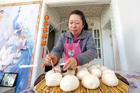 ▲2020年12月31日,李三花在蒸好的馒头上点红点。新华社记者杨晨光摄