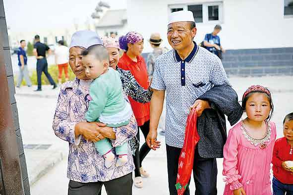 ▲马帮林(右二)与老伴带着孙子踏进润丰村新家(2017年8月17日摄)。