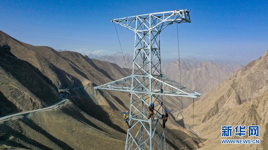 2020年4月28日,在新疆叶城县南部山区海拔3100多米的阿卡孜达坂上,工人登上铁塔检修零部件,为放线做准备(无人机照片)。
