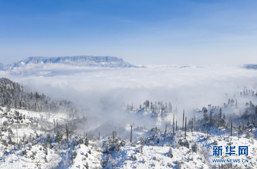 从龙苍沟国家森林公园远眺瓦屋山的景色(2021年1月2日摄,无人机照片)。