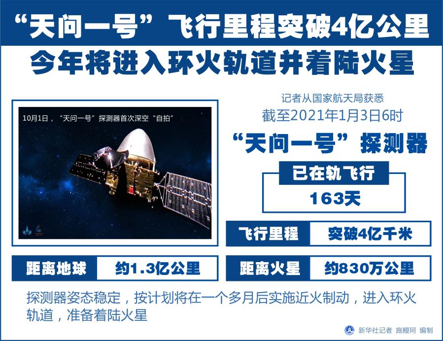 新华社北京1月3日电(记者胡喆)记者从国家航天局获悉,截至1月3日6时,“天问一号”探测器已经在轨飞行163天,飞行里程突破4亿公里,距离地球约1.3亿公里,距离火星约830万公里。探测器姿态稳定,按计划将在一个多月后实施近火制动,进入环火轨道,准备着陆火星。