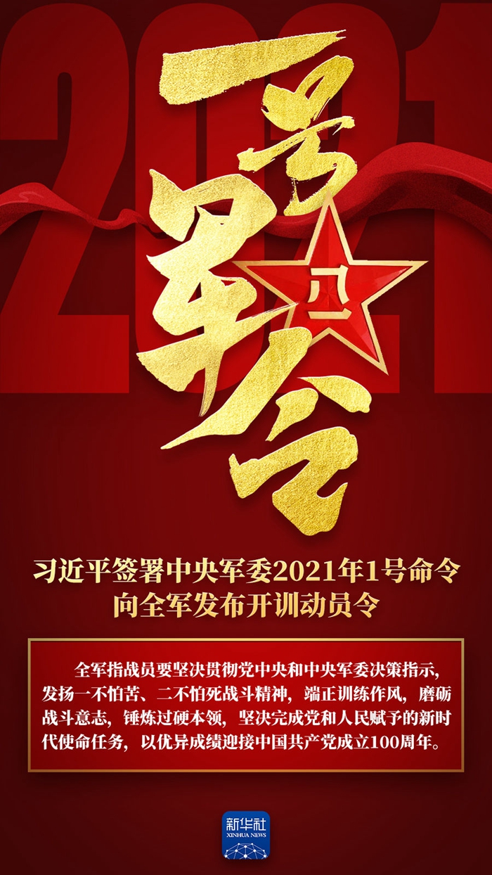 新华社北京1月4日电 中共中央总书记、国家主席、中央军委主席习近平4日签署中央军委2021年1号命令,向全军发布开训动员令。全文如下: