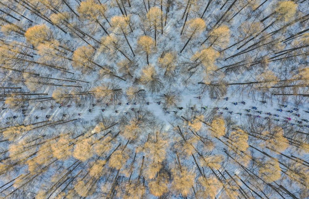 ↑2020年1月4日,参赛选手在2020中国长春净月潭瓦萨国际滑雪节暨2020国际雪联越野滑雪中国巡回赛长春站比赛中(无人机照片)。新华社记者 许畅 摄