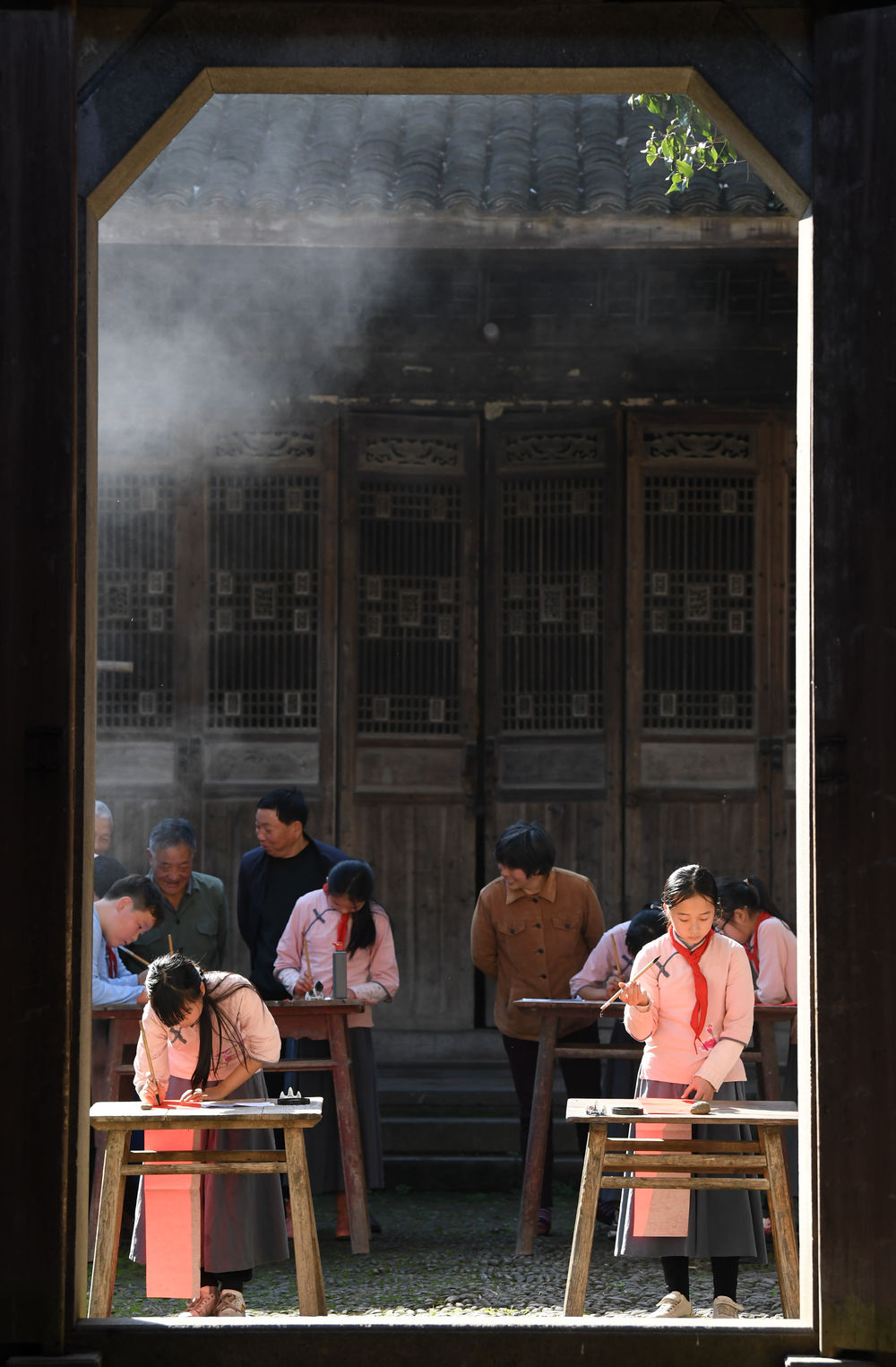 ↑2020年1月7日,新春临近,浙江诸暨东白湖镇斯宅村村民在千柱屋一处天井内观看斯民小学学生写春联。新华社记者 翁忻旸 摄