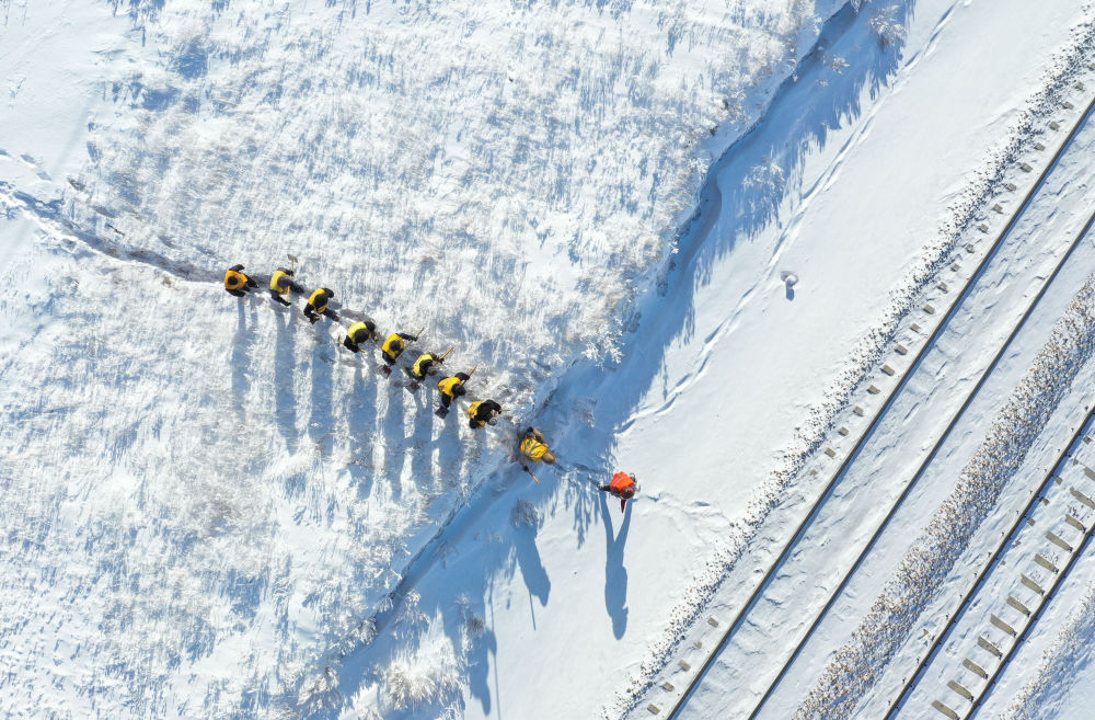 ↑2020年1月13日,中铁呼和浩特局集团有限公司锡林浩特综合维修段白音库伦综合维修车间的职工来到作业点准备工作(无人机照片)。新华社记者 刘磊 摄
