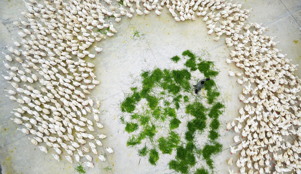 ↑2020年3月11日,工人在贵州省锦屏县铜鼓镇马台生态种鹅养殖基地投放草料(无人机照片)。新华社记者 杨文斌 摄