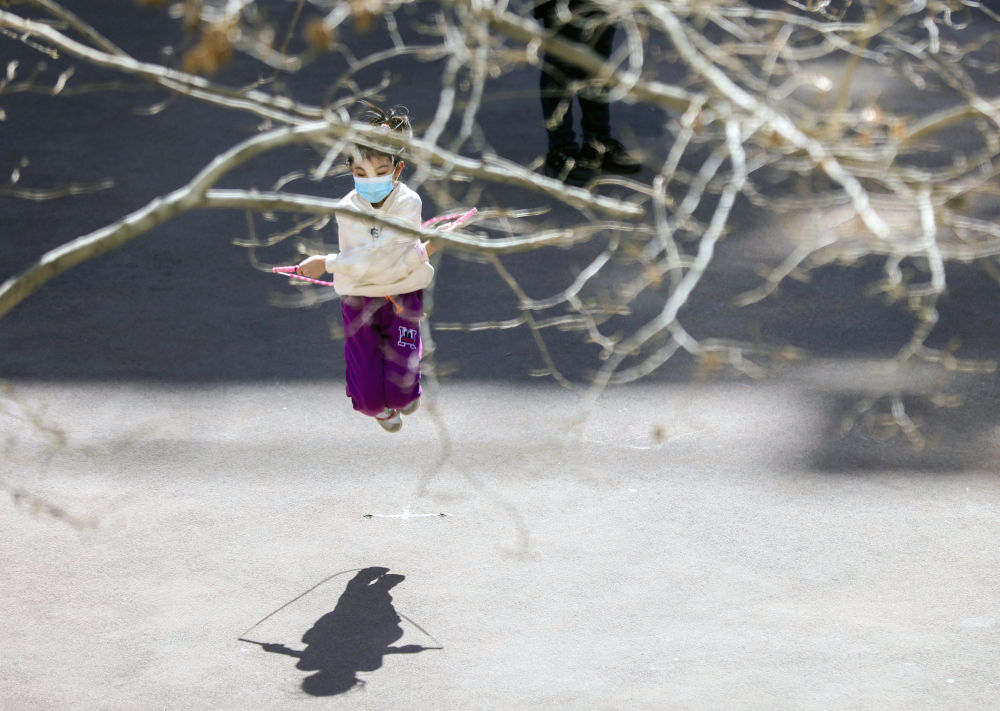↑2020年3月15日,天气转暖,疫情防控形势向好,一个女孩在北京市西城区香炉营东巷某小区的树下跳绳。新华社记者 兰红光 摄