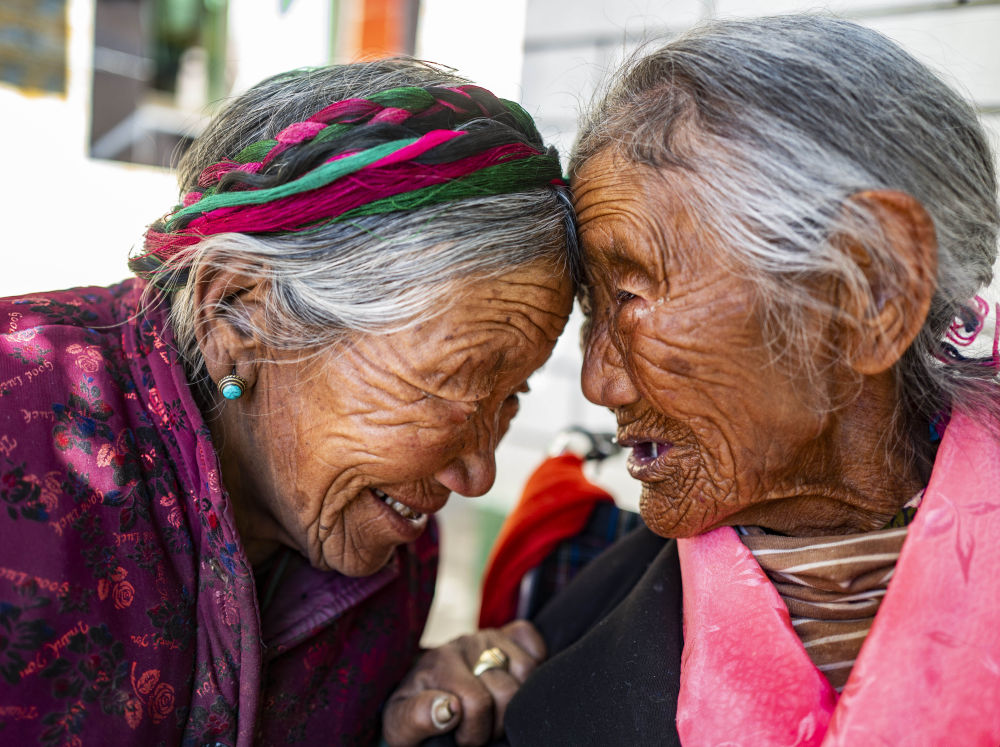 ↑2020年3月24日,在西藏山南市加查县热果村,109岁的索朗卓玛(右)和妹妹次仁行碰头礼。新华社记者 普布扎西 摄