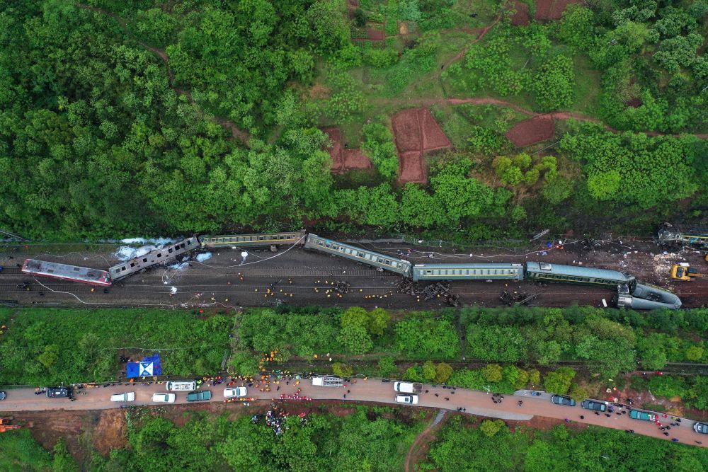 ↑这是2020年3月30日拍摄的T179次列车在京广铁路湖南省郴州市永兴县高亭司镇永华村路段的脱轨现场(无人机照片)。新华社记者 李尕 摄
