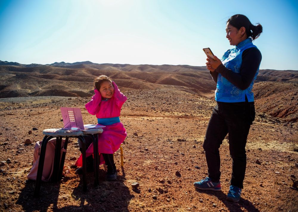 ↑2020年4月1日,内蒙古自治区阿拉善左旗蒙古族学校四年级学生策耿(左)和母亲伊日贵寻找避风处准备上网课。策耿家的牧场位置偏僻,周围是戈壁石山。遇到阴天或者大风天气,家中没有手机信号,只能到附近山地高处寻找信号上网课,但策耿依然坚持每节课都不落下。新华社记者 连振 摄