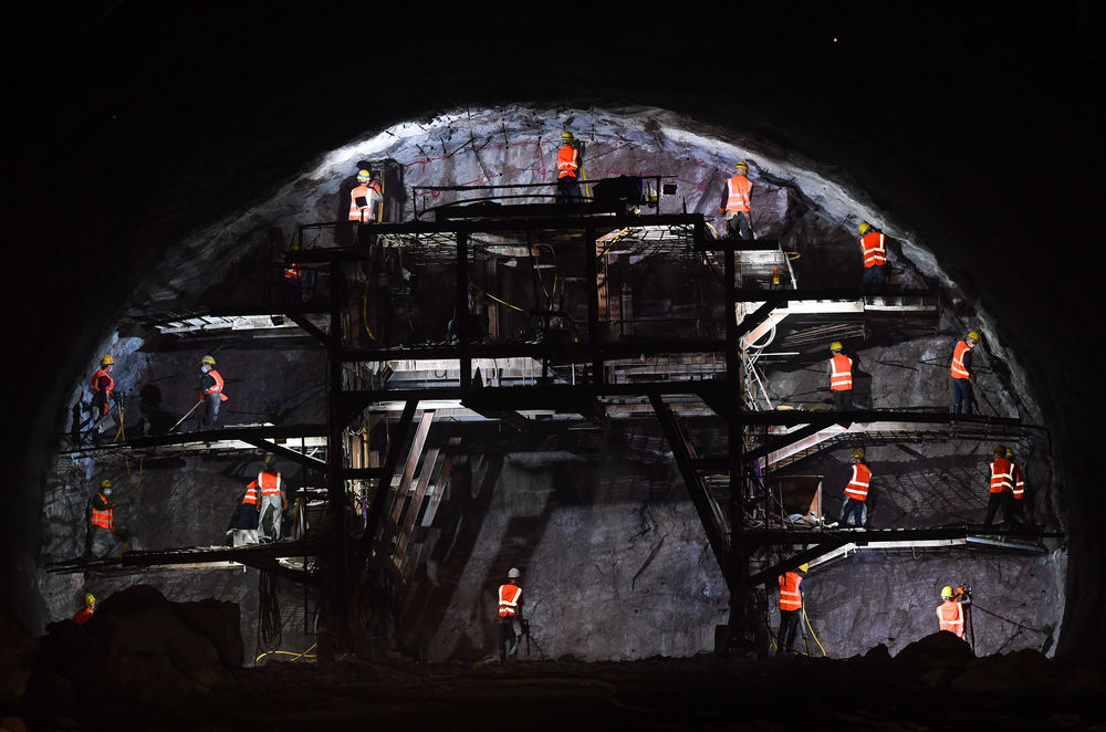 ↑2020年11月19日,在陕西引汉济渭工程秦岭输水隧洞挖掘现场,中铁隧道局的工人在掘进机下开着小型挖掘机清理碎石。新华社记者 刘潇 摄