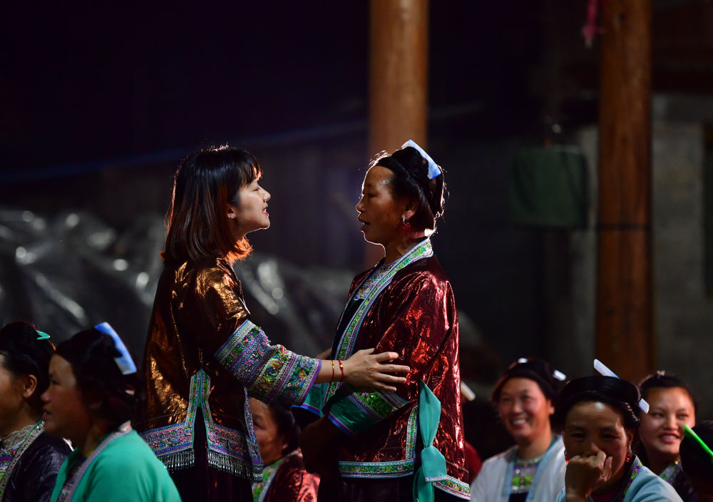 ↑2020年5月8日,在乌英苗寨“双语双向”培训班课堂上,送教老师滚银云(站立者左)指导韦妹丽(站立者右)发音。乌英苗寨位于桂黔交界的大苗山深处,40岁以上的妇女几乎没有上过学。2020年3月以来,有关部门在乌英苗寨举办“我教妈妈讲普通话”的“双语双向”培训班,提供普通话、舞蹈、音乐等培训。新华社记者 黄孝邦 摄