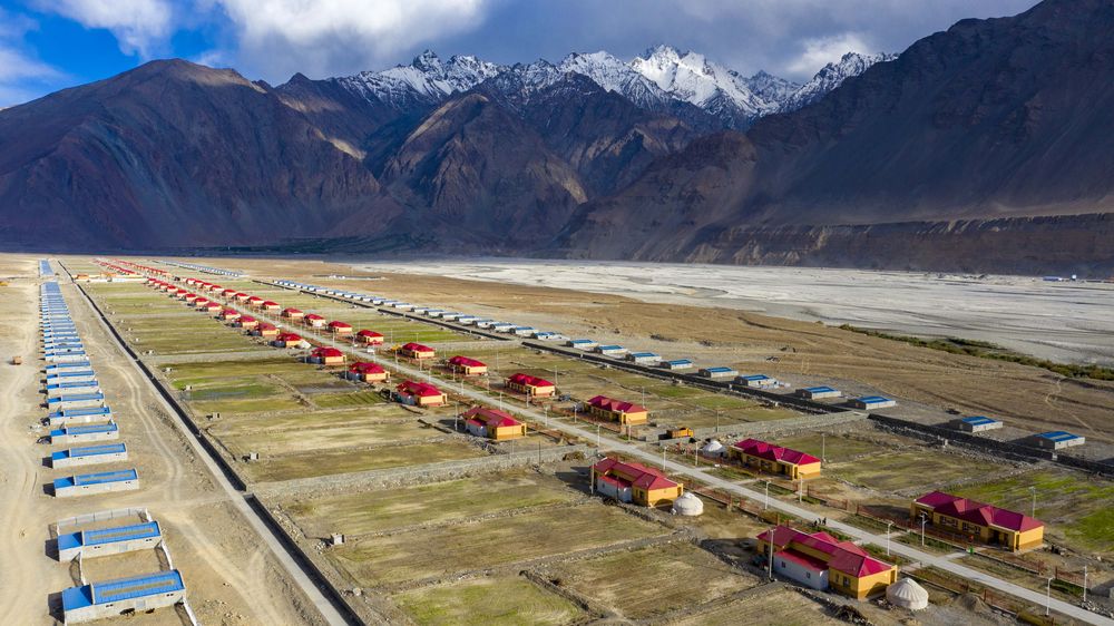 ↑这是2020年6月6日拍摄的新疆喀什地区塔什库尔干塔吉克自治县达布达尔乡热斯喀木村易地扶贫搬迁后的新貌(无人机照片)。新华社记者 胡虎虎 摄