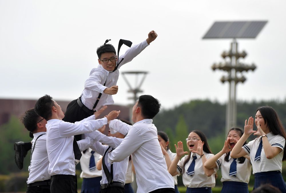 ↑2020年6月10日,在南昌大学校园内,学子们一起欢呼,拍毕业照留念。新华社记者 彭昭之 摄